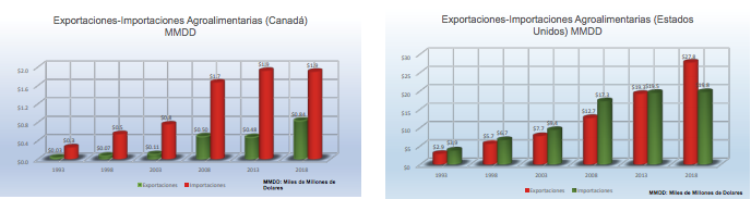 • México es el mercado número uno para las exportaciones estadounidenses de: manzanas, leche en polvo, maíz amarillo, fructuosa y preparaciones para sopas, entre otros. • EE.UU. es el mercado número uno para las exportaciones mexicanas de: cerveza de malta, tomates, aguacate, berries, nueces y pepinos, entre otros7 . • Las exportaciones mexicanas de productos agroalimenticios a Canadá crecieron 24 veces desde la entrada en vigor del TLCAN, al pasar de US$ 34.1 millones de dólares en 1993 a US$ 830 millones de dólares en 20188 . • Los principales productos agroalimentarios que México exportó a Canadá en 2018 fueron: aguacates, cigarros, cerveza, chocolate, mangos, preparaciones alimenticias, productos de panadería, carne de res y fresas9 .