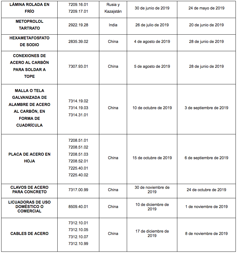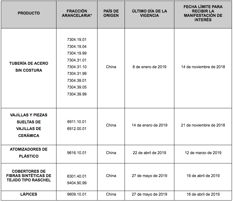 AVISO SOBRE LA VIGENCIA DE CUOTAS COMPENSATORIASCon fundamento en los artículos 1, 2, inciso B, fracción III y 15 fracciones I y IV del Reglamento Interior de la Secretaría de Economía; 11.3 del Acuerdo relativo a la Aplicación del Artículo VI del Acuerdo General sobre Aranceles Aduaneros y Comercio de 1994; 21.3 del Acuerdo sobre Subvenciones y Medidas Compensatorias y 3 último párrafo, 70, 70 A y 70 B de la Ley de Comercio Exterior, se comunica a los productores nacionales y a cualquier otra persona que tenga interés jurídico, que están próximas a expirar las cuotas compensatorias definitivas, que se indican en este Aviso.Cualquier productor nacional de tales mercancías podrá expresar a la Secretaría de Economía, por escrito, su interés en que inicie un procedimiento de examen para determinar las consecuencias de la supresión de la cuota compensatoria que corresponda. En tal caso, deberá proponer un periodo de examen de 6 meses a un año comprendido en el tiempo de vigencia de la cuota compensatoria.La manifestación de interés deberá presentarse a más tardar 25 días hábiles antes del término de la vigencia que corresponda, en la oficialía de partes de la Unidad de Prácticas Comerciales Internacionales, de las 9:00 a las 14:00 horas, cuyos plazos vencen de acuerdo con lo siguiente: